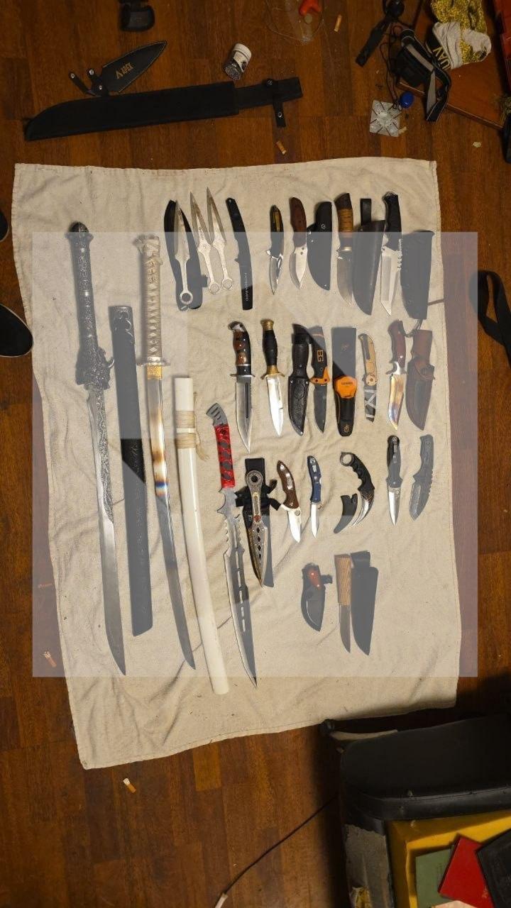 При обыске в квартире задержанного оперативники обнаружили целый склад оружия: охотничье ружьё, коллекцию холодного оружия — от перочинных ножей и боевых мачете до японских самурайских мечей.