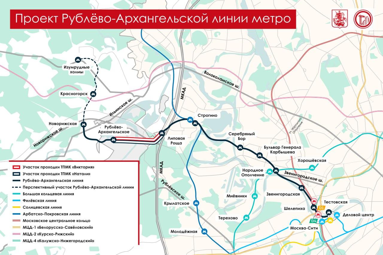 Уже в следующем году планируется запустить движение поездов от станций «Рублёво-Архангельское» и «Новорижская». Общая протяжённость новой ветки составит 27,6 км. Она включит 12 станций от «Москва-Сити» до Красногорска и обеспечит не менее пяти пересадок на другие линии метро.